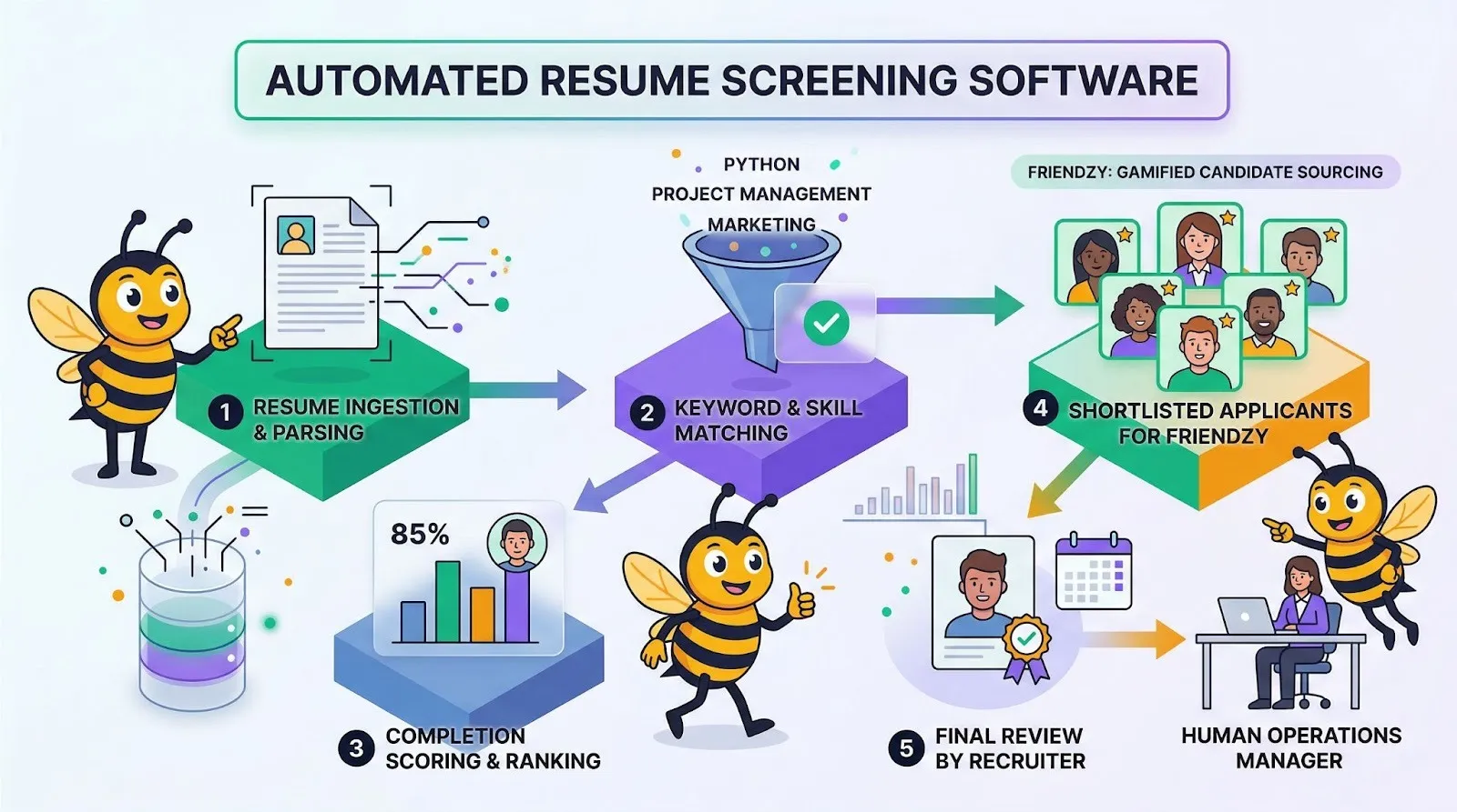 To understand how these agents seamlessly collaborate to eliminate manual work, review the workflow below. The process begins with Friendzy, our proprietary lead-generation tool that uses gamification to source high-quality candidates for less than $1 per lead—long before they ever hit expensive job boards.